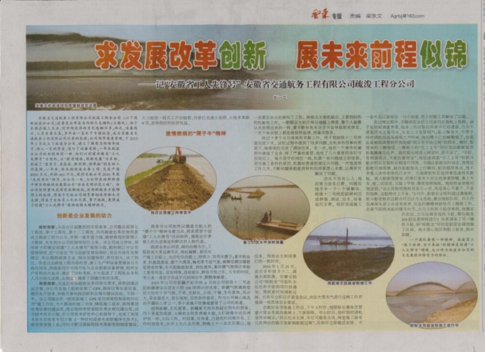 5月20日,安徽工人日?qǐng)?bào)第2版“風(fēng)采”專版大幅刊登了題為《求發(fā)展改革創(chuàng)新,展未來前程似錦》——榮獲 “安徽省工人先鋒號(hào)”的安徽交航疏浚工程分公司先進(jìn)事跡。