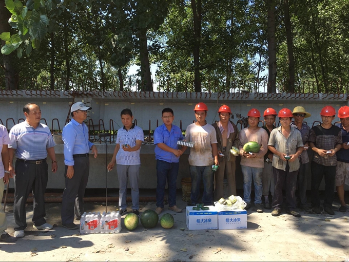 7月23日,蕭楊路項目工地上,工人們從蕭楊路項目部工作人員和業(yè)主、監(jiān)理單位領(lǐng)導(dǎo)手中接過一件件送來的防暑降溫用品。當(dāng)日蕭縣進(jìn)入37℃以上的“燒烤”模式,為給在高溫環(huán)境下辛苦工作的工人們送去一份清涼,保證工人們身心健康,蕭楊路項目部會同業(yè)主單位、監(jiān)理單位開展了“送清涼”到工地活動。