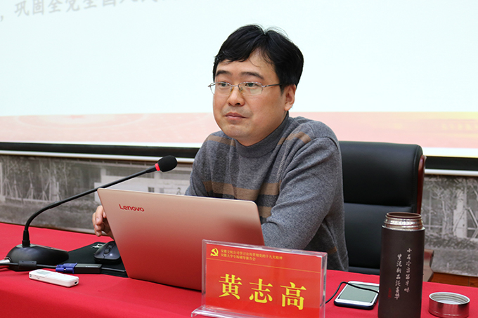 黨的十九大精神安徽“百人宣講團(tuán)”成員、安徽省馬克思主義學(xué)會(huì)常務(wù)理事、安徽省科學(xué)社會(huì)主義學(xué)會(huì)常務(wù)理事、安徽省中共黨史學(xué)會(huì)理事、安徽大學(xué)馬克思主義學(xué)院副教授、碩士生導(dǎo)師黃志高以《學(xué)習(xí)黨章 尊崇黨章》為題,從黨章的類型與作用、黨章的演進(jìn)與發(fā)展、黨章的結(jié)構(gòu)與內(nèi)容、黨章的學(xué)習(xí)與尊崇等方面全面、客觀、準(zhǔn)確、透徹地解讀了《中國(guó)共產(chǎn)黨章程》。針對(duì)黨的十九大修改的黨章條文,黃教授從修改背景、修改意義等方面逐一作了深入闡述。
