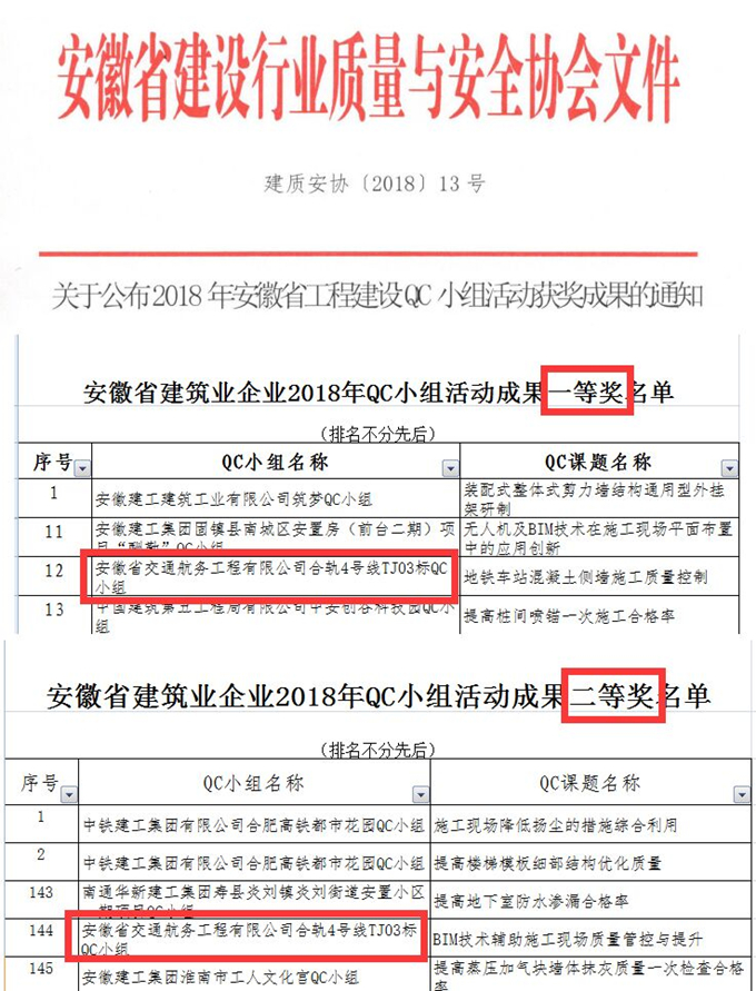近日,在合肥舉行的2018年度安徽省工程建設(shè)QC小組活動(dòng)交流會(huì)上,軌道項(xiàng)目部?jī)蓚€(gè)課題《地鐵車(chē)站混凝土側(cè)墻施工質(zhì)量控制》、《BIM技術(shù)輔助施工現(xiàn)場(chǎng)質(zhì)量管控與提升》分別榮獲QC成果一、二等獎(jiǎng)。