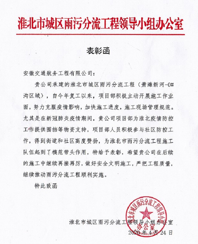 日前,淮北市城區(qū)雨污分流工程領導小組辦公室發(fā)來表彰函,對安徽交航公司在淮北雨污分流工程項目中積極推進復工復產及疫情防控工作給予了高度贊揚,并希望安徽交航公司在后續(xù)施工中再接再厲,做好安全文明施工,嚴把工程質量,繼續(xù)推動雨污分流工程順利實施。