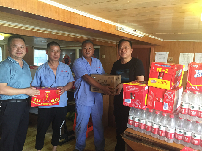 防汛搶險(xiǎn)工作尚未結(jié)束,三伏天的驕陽炙烤著大地,工程船開啟了“鐵板燒”模式。8月6日,公司黨委委員、總經(jīng)理助理董雙武一行冒著高溫酷暑來到皖蛟龍?zhí)柎?duì),親切看望慰問堅(jiān)守一線的船員們,并為他們帶來了飲料、毛巾以及藿香正氣水等防暑降溫物品。