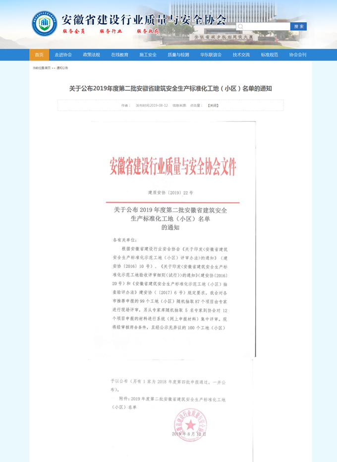 8月7日,安徽省建設(shè)行業(yè)安全協(xié)會(huì)正式公布了《2019年度第二批安徽省建筑安全生產(chǎn)標(biāo)準(zhǔn)化工地(小區(qū))名單》,安徽交航公司承建的合軌4號(hào)線TJ03標(biāo)項(xiàng)目位列其中,榮譽(yù)獲評(píng)“安徽省建筑安全生產(chǎn)標(biāo)準(zhǔn)化工地”。