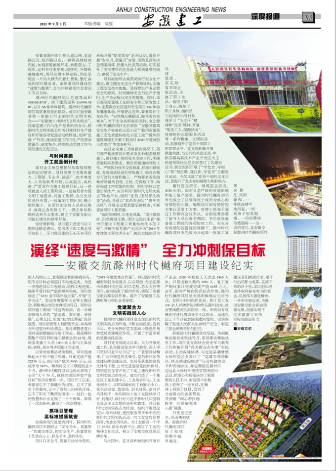 9月1日,《安徽建工》2021年第7期第三版以《演繹“速度與激情” 全力沖刺保目標(biāo)》為題,整版報(bào)道了安徽交航滁州時(shí)代樾府項(xiàng)目建設(shè)情況。